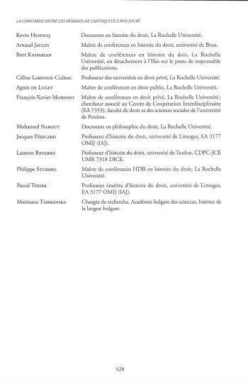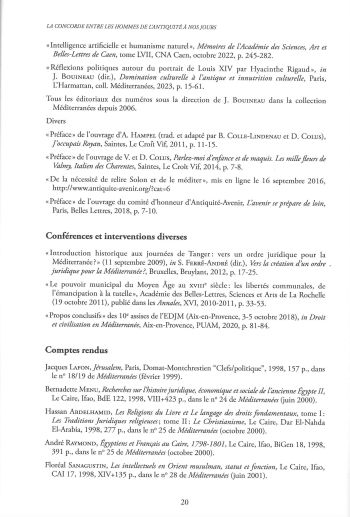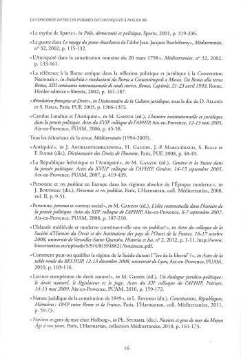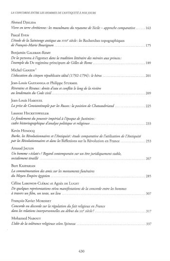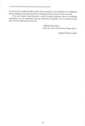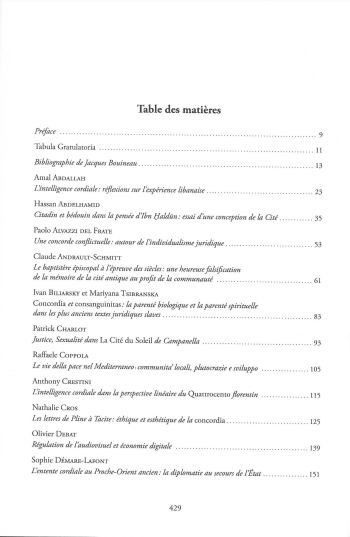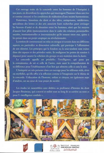 Trois ans plus tard, la veille de mes 70 ans, mon premier élève en poste à L’Université, Burt Kasparian – actuellement directeur des publications de l’IFAO du Caire – m’a remis un livre de Mélanges, qui porte en titre : La concorde entre les hommes de l’Antiquité à nos jours. Aspects culturels et juridiques. Il a assuré seul cette direction d’ouvrage aux Presses universitaires de Rennes, tant dans la coordination du travail académique que dans le choix de la mise en forme matérielle des volumes, puisqu’il en a conçu un à couverture souple, un autre à couverture rigide, et le troisième relié en cuir et cousu main au sein de l’IFAO, aux lettres dorées à l’or fin.